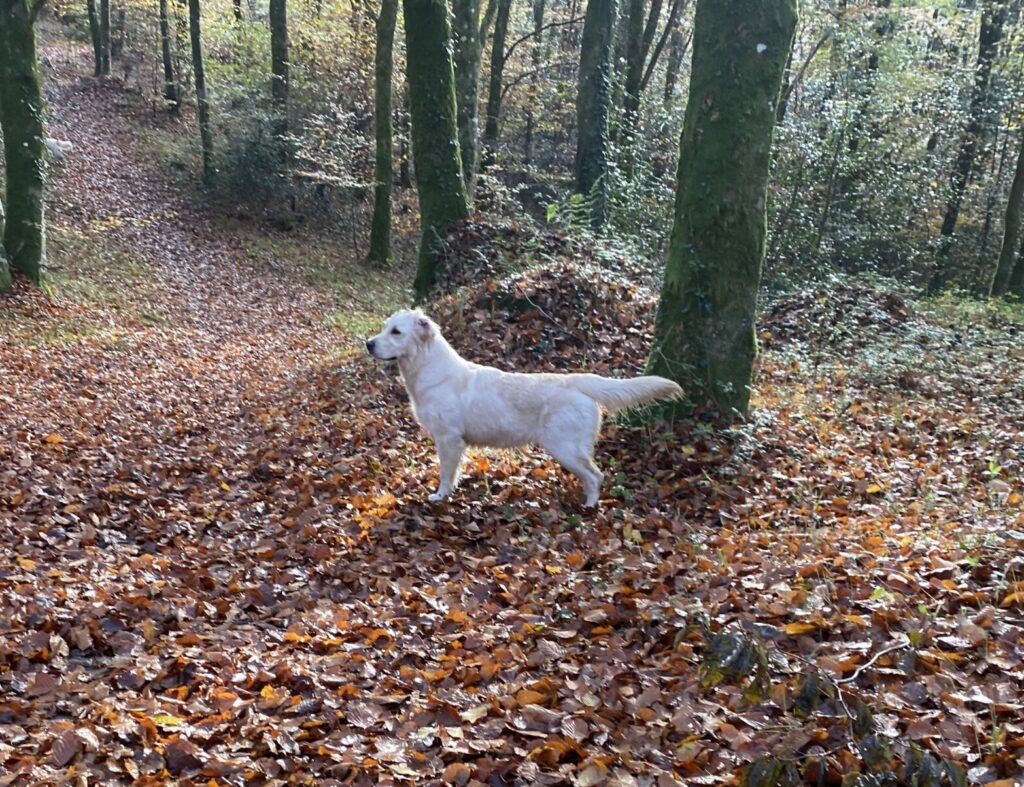 Elle qui était pour une fois propre est immédiatement partie jouer dans les flaques et se rouler dans les feuilles mortes… Il en faut peu pour être heureux !